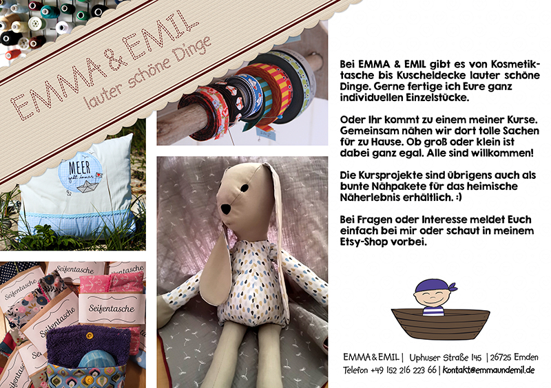 Nähanleitungen (PDF-Format):Kosmetiktasche | Einkaufsbeutel | Hasen-/Rentierkörbchen | WimpelketteEMMA & EMIL ist auch bei Facebook und Etsy zu finden. Erreichbar bin ich auch per E-Mail oder telefonisch. | kontakt(at)emmaundemil.de | 0152-216 223 66